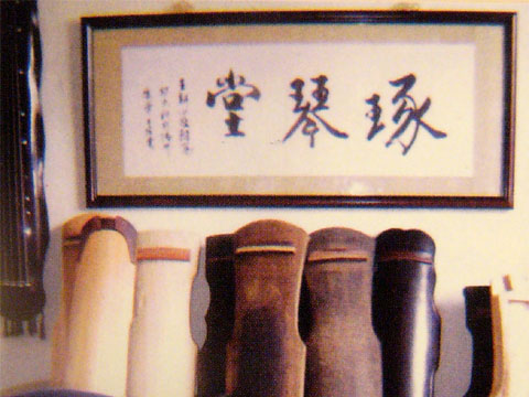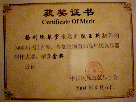 进入扬州市区,赶到下榻酒店,看到玉新兄远远赶来。办妥住店手续,来不及吃午饭,直接赶往“琢琴堂”。途中,路过著名的五亭食品公司,玉新兄买了成箱的五亭包子回家。到达“琢琴堂”的第一件事,就是替我们蒸包子充饥。维扬点心闻名遐迩,再加饥饿是最好的调味品,这顿包子午餐直吃得天昏地暗,味道十分鲜美。提起扬州之行,女儿至今念念不忘五亭包子,常埋怨她母亲回家时没买几箱带回家吃。 吃罢包子餐,在客厅欣赏古琴。墙上挂的,除了玉新兄亲斫的古琴外,还有已故广陵派前辈梅曰强的国画和书法。先听玉新兄即兴弹奏《良宵引》和《梧叶舞秋风》,又试了几张琴的音色,女儿特别喜爱其中一张蕉叶琴,可惜此琴系某高人定制,名琴有主、悻悻作罢。拣三挑四,总举棋不定,最后有劳玉新兄和杜老师,选了两张音色清丽且相近的琴,一为神农式,一为灵机式。选琴之事,就此尘埃落定。接下来,开始商量如何给琴刻上名号,正说得高兴,杭州琴友小李夫妇携爱子匆匆赶到,据说也是为了觅一张好琴远道而来,大家都是同道中人。 晚上,三五琴友聚在玉新兄家吃晚饭。金秋十月菊香蟹肥,大闸蟹伺候。一边滔滔不绝地谈古论琴,一边吃得口水涟涟。席间,玉新兄还邀师妹樊老师一起弹琴助兴。琴友雅集,不亦乐乎;能说能吃,不亦君子乎。●李祥霆所题堂号●玉新兄斫琴●金奖证书