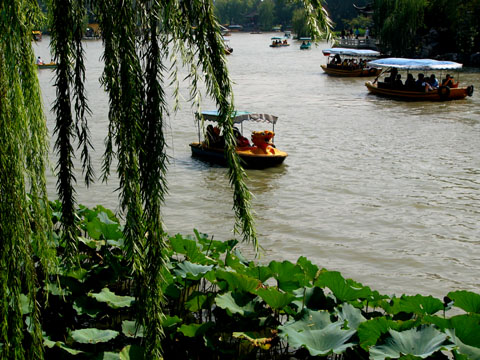 次日安排,是自由活动。按玉新兄的指点,一早就去享受“冶春”的扬州特色小吃。赶到“冶春”,人满为患,好容易混迹进去,吃到的所有小吃全是套餐。食物和游客均匆匆而过,仿佛工业生产的流水线一般。味道不错,但总觉得昨日的五亭包子更好吃。 接着游荷花池。扬州荷花池是免费景点,旅游团队很少光顾。泛舟湖上,看湖中碧波荡漾,水面荷叶田田,享受到片刻难得的幽静。下午赶到瘦西湖和大明寺时,那里却是人山人海。放眼望去全是游客,拍照取景非常困难,用人头挤挤形容,一点也不为过,其环境清净程度和荷花池相比简直天壤之别。●冶春小吃●荷花池●瘦西湖●大明寺