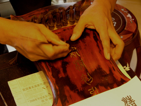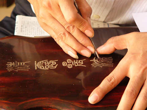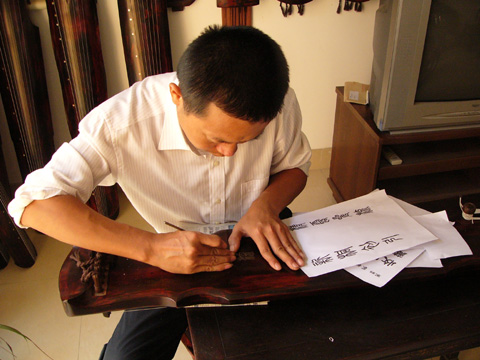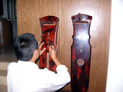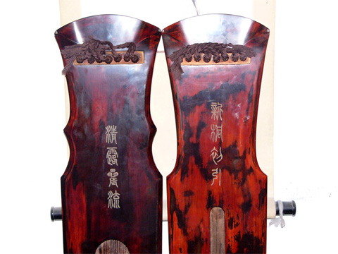 回到“琢琴堂”,已是黄昏时分。玉新兄正在为昨天选的那两张古琴刻字留号,很优雅的小篆体。字号的内容,是采萝引经据典早已拟订好的,用的是李清照的两句宋词,一曰清露晨流,一曰新桐初引。据说出处还挺有典故。 晚饭时分,琴友小李夫妇也都赶回“琢琴堂”,一起到玉新兄安排的餐馆用餐。以琴的名义,饕餮了一顿地道的维扬家常菜。餐毕,回“琢琴堂”,再赏古运河之夜景。因行程安排,次日均要打道回府。与玉新兄相约九寨再聚,留下各自电话,与杜老师和琴友小李夫妇道别。带上“清露”琴,留下“新桐”琴。拜托玉新兄将采萝的新桐琴长途专业托运。托运之路遥遥,自然不能夹带五亭包子和大闸蟹之类了。●返回已是黄昏时分●玉新兄正在为两张古琴刻字留号●一曰清露晨流●一曰新桐初引●精心雕琢●顺利完工●双琴合壁